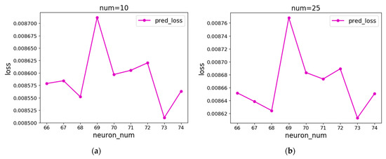 It can be seen from Figure 10 that the error fluctuates as the number of neurons changes. When the number of neurons is about 70, the error is small, which means that the loss of the network is relatively small and stable when the number of neurons is about 70, and the optimal number of neurons is about 70. Therefore, the number of neurons is set from 66 to 74 for the experiment. As can be seen from Figure 11, when the number of neurons is 67, the prediction error is the smallest, that is, when the Sigmoid function is used as the excitation function of the BP neural network, the optimal number of neurons is 67.