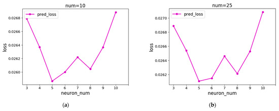 When LSTM is used to predict precipitation, network parameters of LSTM should be determined first. First, the learning rate [60,61] is fixed to 0.01 to determine the remaining parameters, and then the parameters including the number of LSTM network layers and the size of the hidden layer in the LSTM network will be changed. For LSTM networks with different parameters, take the first NUM minimum errors, and the average prediction error is shown in Figure 8.