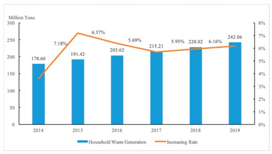 Driven by the growing populations and rapid urbanization in the past 20 years, the amount of global waste reached 2.01 billion tons in 2016 [1]. Meanwhile, in developing regions such as China [2], household waste generation jumped to 242.06 million tons in 2019 (Figure 1), and the figure increased by an average rate of 6.27% per year [3]. China has thus become the largest waste generator in the world [4].