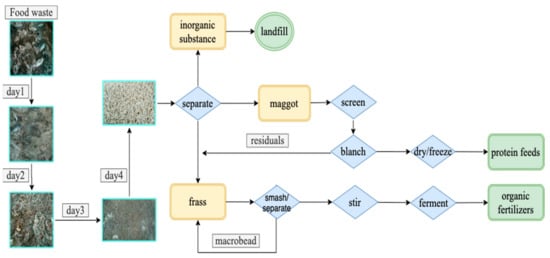In terms of value-added household food waste, a new strategy is to use food waste as the basis to cultivate edible insects [55]. Maggots can be cultivated in a high-density environment and are easy to manage procedurally. However, due to the production of a large number of leachate, the maggot bioconversion technology would not be profitable when the amount of food waste is over 200 tons/day according to the investigation. Therefore, maggots are proposed as a means to utilize food waste in regions with an output of less than 200 tons/day.