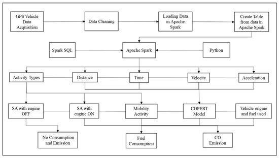 This section describes our approach such as data collection, data preprocessing, data storage in Apache Spark, Spatio-temporal queries, COPERT Model implementation in Apache Spark using Pyspark. The flowchart of the methodology is shown in Figure 2.