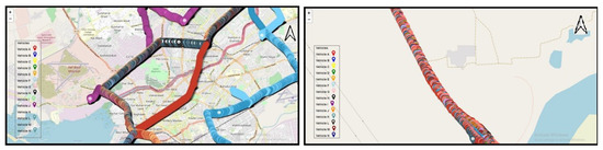 As the datasets were huge, the vehicles are classified city-wise and accordingly spatial queries are written in Apache Spark. Figure 3 and Figure 4 show the vehicles which are in the proximity of Islamabad, Lahore, Karachi and Motorway, respectively. The visualization shows vehicles movement for a given time duration with a temporal resolution of 5 s. The vehicles are traveling all over the city and depict the traffic conditions on the road such as traffic congestion, fuel consumption, vehicles on the road, vehicles around the traffic signals. All these parameters can be extracted from the data using distance covered in the control points along with the velocity. If there is a frequent change in velocity, this means it can be due to a populated commercial place, which causes small traffic congestion. These are the areas on the roads where vehicles are wasting fuel and energy and causing the environmental problems.