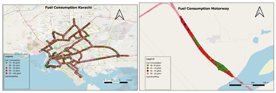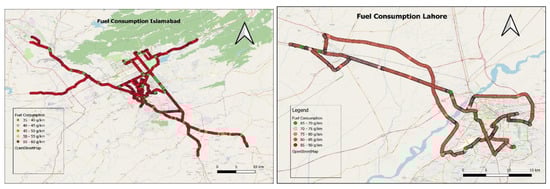 Furthermore, the estimates take into account all the scenarios during vehicle movements. For example, mobility activity depicts that on the road, the vehicle is moving freely and the road has no congestion. Similarly, in stationary activity with an engine on the road, the vehicle is unable to move freely due to congestion. When scenarios are run in different cities, vehicle fuel efficiency is calculated and accordingly maps are generated. The visualization of fuel consumption for different cities can be visually analysed in Figure 5 and Figure 6. The volume of fuel consumption of vehicles depends not only on the vehicle engine but also on the road, city, and traffic conditions. As fuel consumption is estimated for all cities in the study, in Islamabad during peak hours, the vehicles covered 12 km distance in 25 min. The fuel consumed during this ride is almost 55 g/km. This means that roads have a lot of traffic in Islamabad during these peak hours; thus vehicles travel slowly in areas such as Kashmir Highway. In the off-peak hours, the vehicles travelled 17 km distance in 20 min and consumed 60 g/km. Therefore, the traffic on the roads during off-peak hours is apparently less and vehicles travel smoothly, covers more distance in less time and does not consume extra fuel.