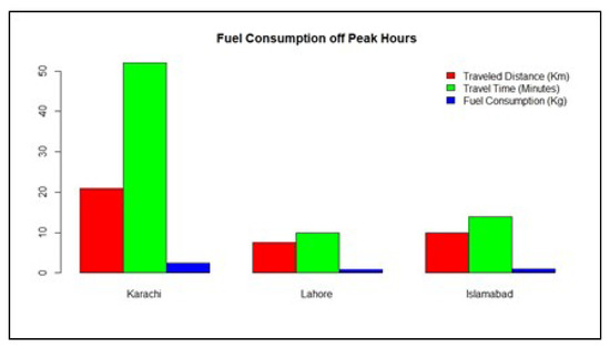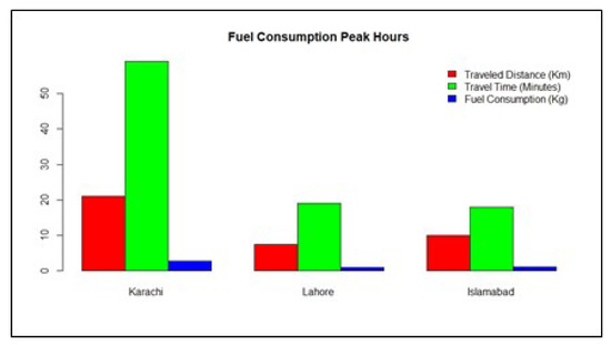 Similarly, the fuel consumption is estimated for Lahore during peak hours (see Figure 7). The vehicles covered 7.5 km distance in 19 min and fuel consumed is 80 g/km. The traffic on the roads is higher during peak hours because Lahore is the capital of Punjab and it is the most populated city of Punjab. During peak hours, the vehicles are unable to cover much distance, and faces hurdles in movement and spends extra time on roads. In off-peak hours in Lahore, the vehicle travelled 12 km distance in 21 min and consumed 85 g/km of fuel (see Figure 8). Likewise, fuel consumption is estimated for Karachi during peak hours. The vehicles covered 21 km distance in 59 min and fuel consumed is 95 g/km. Karachi is one of the most populated city in the world. When the data were analyzed, it was evident that there was no significant difference between peak and off-peak hours because Karachi roads remains crowded most of the time as shown in (see Figure 7 and Figure 8). The vehicles experience hurdles in covering distance quickly. Accordingly, Karachi’s fuel consumption is not great in comparison to Islamabad and Lahore. The fuel consumption on the motorway is different from the internal cities of Karachi, Lahore, and Islamabad. The results show that on the motorway vehicle moves freely. The vehicle movement all over the day remains the same as either peak or off-peak hours (see Figure 9).