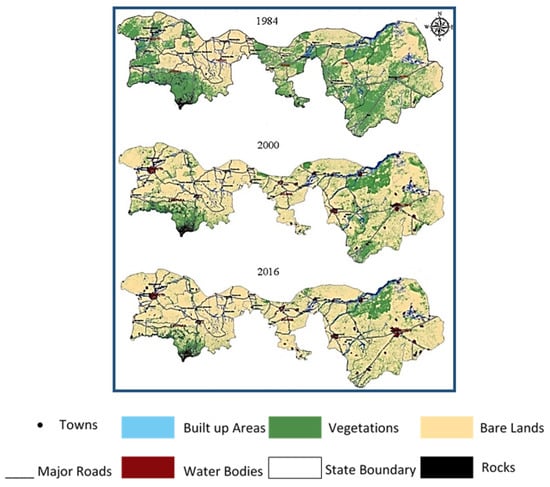 Spatial variation and temporal changes in land cover are shown throughout the study from 1984 to 2016. Adapted with permission from Elsevier Ref. [12].
