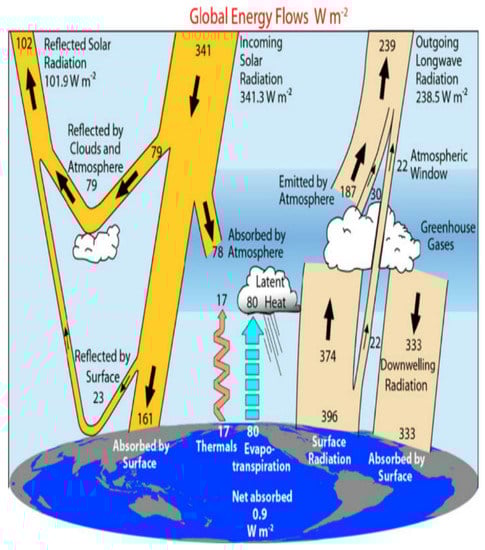 Without the greenhouse effect, life on Earth is not possible. It is a natural phenomenon that occurs when the gases in the atmosphere trap the heat coming from the sun. The fundamental physics of this process have been understood; the sun pours out large amounts of radiation across the electromagnetic spectrum. As incoming solar radiation is absorbed and reemitted back from the Earth’s surface, as infrared energy, the greenhouse gases (GHG) prevent some of this heat from escaping, instead of reflecting the energy to heat the planets [19]. Figure 2 illustrates the magnitude of sun radiation streams, which is based on the available observational data. The radiant energy flux is about 341 Wm−2 for each square meter between the Earth and the sun. About 30% of this radiation is reflected back to space by ice, deserts, and clouds, leaving 239 Wm−2 available to the climate system. The atmosphere is transparent to short-wavelength solar radiation, and only 78 Wm−2 is absorbed by it, leaving about 161 Wm−2 to be transmitted to the surface. Because of greenhouse gases and clouds, 333 Wm−2 of back radiation also warms the Earth’s surface from the atmosphere. Thus, the surface will emit heat radiation of about 396 Wm−2, which is 157 Wm−2 greater than the 239 Wm−2 that leaves the top of the atmosphere [20]. The greenhouse effect makes the Earth a comfortable place to live, warming the planet and providing all the energy that drives the climate system. Anthropogenic GHG emissions are a change in the Earth’s energy balance, between incoming solar radiation and the heat released back into space, increasing the negative impact of the greenhouse effect, and resulting in climate change [21,22].