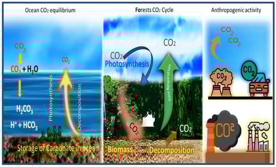 Schematic diagram of the natural balance and industrial emissions in carbon dioxide. Reproduced, adapted and reprinted from Reference [27].