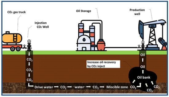 Enhanced oil recovery (EOR) using CO2, called CO2-EOR, has the following two benefits: the first is to recover additional oil, thus saving energy and additional revenues (Figure 8). The second benefit is the mitigation of climate change, brought about by a reduction in anthropogenic carbon dioxide emissions [64]. The injection of carbon dioxide into oil wells could increase oil production, as shown in Figure 8 [65]. Approximately 0.1 to 1.8 gigatons can be used and stored at projected costs, ranging from USD 40 to USD 60 per ton of CO2 per year in 2050 [66]. Aramco can capture and process 45 million standard cubic feet of CO2, then send it through an 85 km pipe to the Uthmaniyah oil field to be injected into the oil reservoir. Uthmaniyah is the Middle East’s largest carbon EOR initiative that aims to reduce emissions and improve oil extraction [67]. CO2-EOR reduces the proportion of carbon dioxide in the atmosphere to 30–40%, compared to natural sources [68].