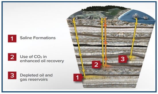 CO2 storage in geological formations involves injecting CO2 captured from emitting resources into rock formations that are deep underground. CO2 is then permanently removed from the atmosphere. Figure 10 shows the geological storage sites underground. CO2 storage has been implemented in depleted oil and gas fields [84,85]. Several projects, such as the Sleipner, Snøhvit, and In Salah projects, store 1 to 3 Mt of CO2 from gas processing each year. The underground storage of hydrocarbons has a long and successful history. In Canada, for example, around 5 Mt of acid gas has been safely stored in depleted reservoirs [86,87,88]. These examples will help in understanding the application and process for other CO2 storage projects, concerning technical issues, regulatory requirements, costs, and economic viability.