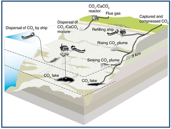 The captured carbon dioxide can be injected into the ocean, where it is stored out of the atmosphere for centuries. The CO2 can be transported via a pipeline or ship for release into the ocean. There have been many small-scale field experiments and over 25 years of studies of CO2 ocean storage, but it has not yet been implemented or completely evaluated [93]. However, for this technology to be deployed widely, it should be cost-effective, the environmental impacts must be considered, the techniques must be politically and legally feasible, and scientific certainty must be increased as to the effectiveness of the oceans to sequester CO2 safely [94]. Figure 11 shows an illustration of some ocean storage strategies [93].