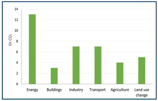The options leading to the reduction in carbon dioxide emissions must first be defined, and then measures to reduce these emissions must be established [97]. Figure 12 shows the world’s sources of fuel-emitted carbon dioxide [98]. The CO2 emissions increased to 164.4%, and, based on IPCC estimates, the main carbon dioxide emission source over the 2008–2017 period is the energy sector [66], as illustrated in Figure 13. Given the urgent need to begin the shift towards greater emission reductions, it is imperative to define how mitigation measures are tailored to the mid-2050s, to see which measurements can be applied at present and which measures require longer lead times to be implemented. This problem could be partially solved by using clean energy sources, such as natural gas [99], geothermal power [100], solar power [101], wave energy [101], wind energy [102], biofuels [103], nuclear power [103], and by improving the quality of oil-based energy sources and reducing carbon dioxide emissions.
