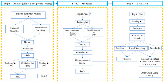 To achieve the research objectives, this study designs a three-step research process, as shown in Figure 1. The first step is data acquisition and preprocessing. Financial variables and non-financial variables data are sourced from Taiwan Economic Journal (TEJ) on the companies with going concern doubt and without going concern doubt. All the data are randomly distributed into the training dataset, the validation dataset, or the test dataset. The second step is modeling, by inputting the data from the training dataset and the validation dataset into the LSTM model and the GRU model for deep learning. The third step is evaluation, by testing the data in the test dataset to assess the model performance and present the effectiveness of going concern prediction models.
