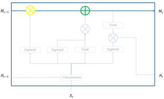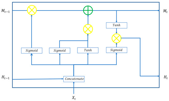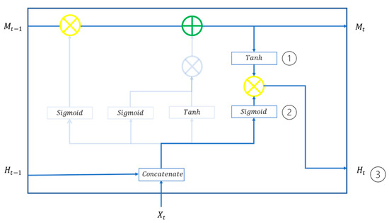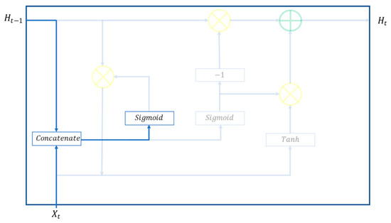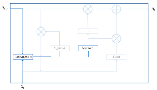 The gate control mechanism consists of a forget gate (), an input gate (), and an output gate (). The forget gate (), as illustrated in Figure 3, serves to determine which information in memory cells should be forgotten with a Sigmoid activation function, based on the input results from the previous period () and new information inputted during this period (). This is expressed with Equation (1) where is the weight of the forget door and is the bias of the forgotten door.