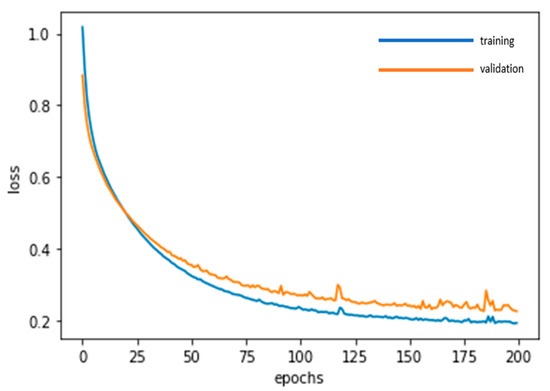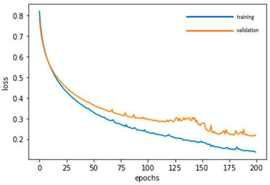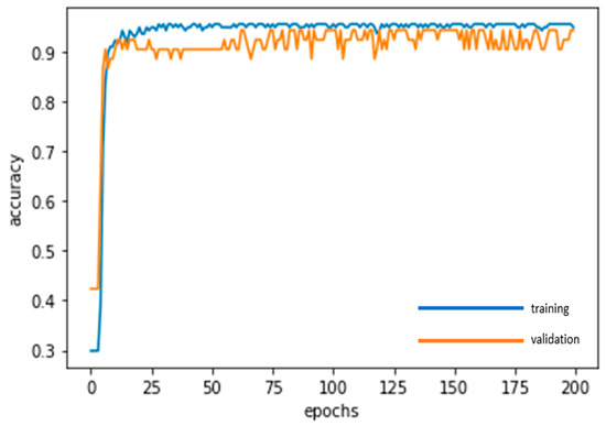 In a similar vein, the training dataset and the validation dataset are used for the GRU deep learning and repeated adjustments until the model becomes stable. The loss function in Figure 14 and the accuracy in Figure 15 gradually converge during the training process and stabilize after 200 epochs (which requires 1.4 s). The training dataset yields an accuracy of 94.81%, while the validation dataset is 94.23%.