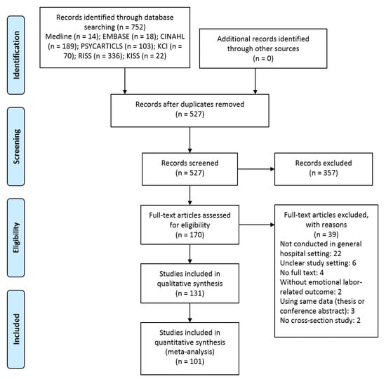 As a result of the literature search, 527 studies were searched, excluding duplicates. Among them, 172 potentially relevant articles were selected for the first screening process. As a result of the secondary screening of the full texts, 22 which were not conducted in general hospital settings [28,29,30,31,32,33,34,35,36,37,38,39,40,41,42,43,44,45,46,47,48], 6 which did not confirm the hospital where the research had been conducted [49,50,51,52,53,54], 4 which did not include the full text [55,56,57,58], 2 which did not use emotional labor [59,60], 3 which used the same data as other journal articles (thesis or conference abstract) [61,62,63], and 2 studies that did not have cross-section designs [64,65] were excluded. Finally, 131 studies were included in this review [66,67,68,69,70,71,72,73,74,75,76,77,78,79,80,81,82,83,84,85,86,87,88,89,90,91,92,93,94,95,96,97,98,99,100,101,102,103,104,105,106,107,108,109,110,111,112,113,114,115,116,117,118,119,120,121,122,123,124,125,126,127,128,129,130,131,132,133,134,135,136,137,138,139,140,141,142,143,144,145,146,147,148,149,150,151,152,153,154,155,156,157,158,159,160,161,162,163,164,165,166,167,168,169,170,171,172,173,174,175,176,177,178,179,180,181,182,183,184,185,186,187,188,189,190,191,192,193,194,195,196]. Among these, 101 studies were included in the meta-analysis [67,68,69,71,74,77,78,80,81,82,83,84,85,86,87,88,89,90,91,92,94,96,97,98,100,102,103,104,105,106,108,109,110,111,112,113,114,117,118,119,120,121,122,123,124,125,126,128,129,130,131,132,133,136,137,139,141,142,143,144,145,147,148,149,150,151,152,154,155,156,157,158,159,161,162,164,166,167,168,169,170,171,172,174,175,176,178,180,181,183,184,185,186,187,188,189,190,192,193,194,195] The PRISMA flow chart for this review is shown in Figure 1.