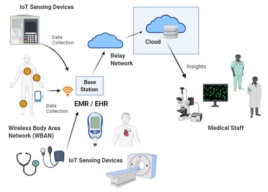 In general, a typical MIoT healthcare system comprises of a series of medical IoT devices that are embedded with various kinds of intelligent sensors that can perceive their surroundings [31,32]. The collected medical data can be processed either by a smart device itself or in the cloud, where a wireless medium is used to transfer the collected health information to the relevant stakeholders, which helps them to make decisions about the patient’s condition [10,22,32,33,34,35]. In addition, such smart devices can be further connected to worldwide information networks for convenient and on-demand access.