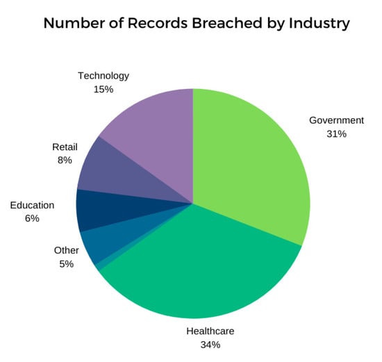 The integration and the connectivity of physical things in the MIoT environment to the Internet means the possibility of remote access to the devices, which are made for the monitoring, analysis, forecasting, and storage of vital medical data [36,37]. On the other hand, these integrated IoT technologies introduce various vulnerabilities, owing to the rapidly evolving IoT threat landscape, where intruders can exploit and gain access to the MIoT network to further exploit the entire medical network/environment. This ultimately leads to situations where the security and privacy of the devices and patients are at risk. As the volume of data that is handled and generated by MIoT devices grows exponentially, it will eventually lead to the greater exposure of confidential medical data, which necessitates further study on the matter. Hence, the security and privacy of the data obtained from MIoT devices, which are either stored in the cloud or in remote servers or obtained during the transmission to the cloud or remote servers, are becoming a major unresolved concern in healthcare, where less attention is paid by the industry and the academic community [10,17]. Moreover, based on recent statistics [30,31,32,33,34,35], the healthcare sector leads in terms of the sectors that have been breached by cyber-attacks in recent times, as depicted in Figure 2 [15,16,17,18,19,20].