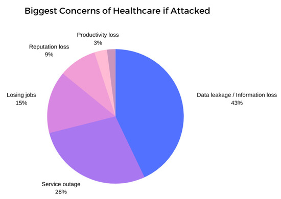 With the exponential growth of Internet-connected MIoT devices, confidential patient information is exposed to outside parties that can be accessible in numerous ways. For an instance, an intruder can eavesdrop through the wireless communication network and sniff for data that is being exchanged over the wireless network to access confidential patient data. In worst-case scenarios, intruders can remotely access the control unit of the medical device and can then control the device, jeopardizing the lives of patients [5,37]. Moreover, it would be a huge threat to the patient’s privacy if a passive network observer could infer confidential patient information from the network traffic, especially when then inferred information can be used for abusive purposes following the attack [38,39]. It is evident that the lack of adequate knowledge about MIoT security among the end-users and the relevant stakeholders (e.g., medical staff, patients, caregivers) may also exacerbate vulnerabilities and may encourage attackers to further exploiting MIoT technologies, ultimately endangering the lives of patients in most cases [5,8,10,12]. Not only that, but in case of any cyber-attack, the biggest concerns or threats for healthcare would be data leakage or information loss, eventually resulting patient data being compromised, as depicted in Figure 3. Nevertheless, recent trends indicate that with the ever-increasing cyber-attacks that target healthcare, the healthcare IoT security market is expected to undergo rapid growth by the year 2025, with a total revenue of USD 100 billion, which also justifies our efforts to examine the current state of security and privacy of the MIoT through this study [38,39,40,41].