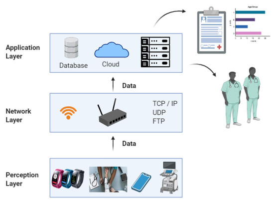According to the three-layered architecture, the bottommost layer is the perception layer, which is responsible for gathering the medical data from the physical MIoT devices, such as wearable’s, smart blood glucose meters, ECG monitoring devices, and so on. Then, the network layer mainly consists of wireless, wired, and middleware systems, which facilitate the smooth delivery of gathered medical data, towards the destination. With the aid of underlying technological platforms, the network layer first processes and communicates the acquired data from the perception layer to the application layer, which is the topmost layer in the architecture. The application layer comprises medical data repositories to offer tailored and personalized medical services and to address the needs of end-users, who are patients, medical professionals, caregivers, and insurance companies [11,17]. An important fact is that the underlying technologies used by each of these layers are different from one another. Altogether, the MIoT devices and integrated technologies are used to provide a variety of services, each with its own requirements and limitations [13,17].