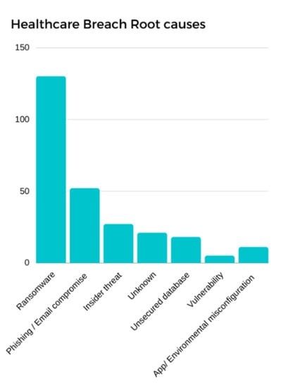 On the other hand, recent studies indicate that at least one security breach has been reported by nearly 90% of healthcare organizations involving MIoT devices [52]. Around 45% of all ransomware attacks that occurred in 2017 targeted healthcare organizations [53]. For example, the medical records in an Indiana hospital in the USA were encrypted by attackers, forcing the hospital to pay a USD 50,000 ransom to recover the data in 2017. By October 2016, 14 hospitals had reported ransomware attacks that had used medical devices as a gateway [58,59]. With more than 200,000 devices around the world, the biggest ransomware attack on medical systems was recorded in 2017 [12,54,55,56] and was known as WannaCry. It exploited vulnerabilities in the Windows OS and prevented medical staff from accessing affected computers [59,60,61,62,63,64,65], thus delaying critical patient care. Those ransomware attacks and hacking demonstrations imply that there is a high possibility of MIoT devices becoming compromised due to a lack of inbuilt security and a lack of user knowledge. In addition, the lack of environmental configurations in the MIoT ecosystem can also put MIoT devices at risk. Based on the latest statistics, it is evident that ransomware holds the first place among many other root causes that are responsible for the majority of healthcare data breaches, as depicted in Figure 6 [63,64,64,65,66,67,68,69,70,71,72,73,74].