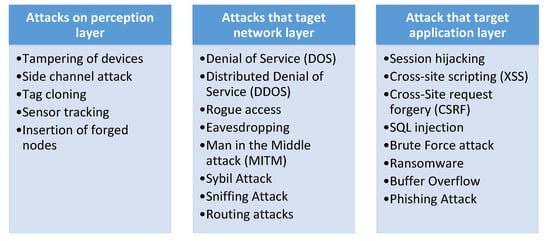 The integrity and the privacy of data are compromised by attacks on these perception layer devices and can thus lead to adverse outcomes that can be fatal. Possible attacks that target the perception layer are listed below: