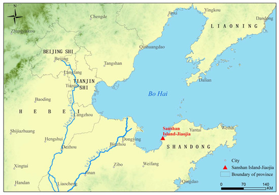 Laizhou Bay. The red triangle mark is where Sanshan Island-Jiaojia is located.