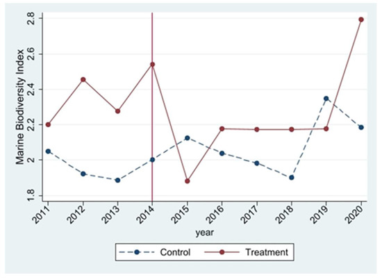 We selected 11 national key monitoring bays regarding marine biodiversity, including Laizhou Bay taking 2015 as the dividing line, the initial large-scale exploration year (7), as the treatment group, and the remaining ten bays as the control group. Table 1 gives the estimated average treatment effect on treatment (ATET), indicating that the biodiversity of Laizhou Bay has decreased by 0.27 percentage points compared with the bay where gold exploration has not been implemented [21]. One basic premise of the DID is that if the processing group is not affected by external shocks, its trend should be the same as the control group (so the latter can be used to control the time effect). This is the so-called parallel trend. Figure 2 below visually shows the idea of DID and the test of the parallel trend hypothesis.