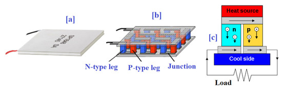 The overview of the TEG module is shown in Figure 1a. The fundamental element is a thermocouple that contains p-type and n-type semiconductors [1,2,3,4,5,6,25,26]. These conductors were electrically interconnected in series using a metal strip. To build a TEG module, several p-type and n-type pellets were interconnected together to increase the required rating of the output power as presented in Figure 1b. They were electrically linked in series to boost the voltage potential, and thermally in parallel to decrease the thermal resistance [26,29,30,31]. The couples were inserted between two parallel ceramic sheets to form a hot side and a cold side. When there was a temperature variation between the hot part and the cold part, a direct current flowed in the load as presented in Figure 1c.