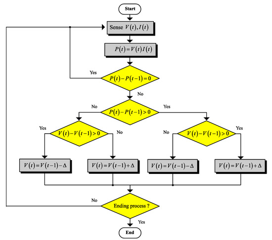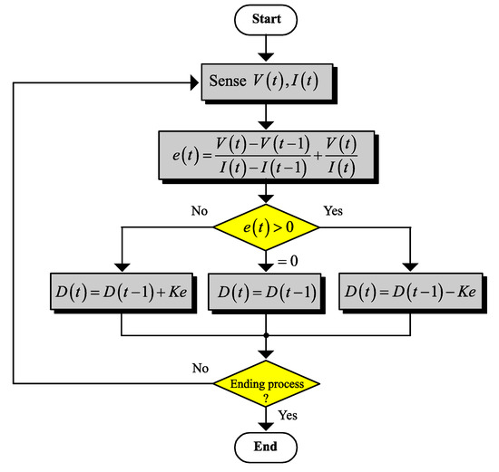 Recently, an enormous set of MPPT approaches has been introduced in the literature, of which hill climbing (HC) [14], P and O [7,11,15], incremental conductance (INC), and/or incremental resistance (INR) [14,16,17,18] are the most widely investigated. As is known, the HC-based MPPT approach introduces a disturbance in the duty cycle of the converter [14]. However, the P&O technique introduces a disturbance in the operative voltages of energy converters [14,15]. Thus, in the two discussed MPPT approaches, a tradeoff should be considered in selecting the amount by which to augment the control law, i.e., the PWM duty cycle or reference voltage, is updated; large values decrease the MPP steady-state due to the huge disturbances around it, while lesser values decrease the dynamic action under a rapid variation in the operational conditions or load. The INR- or INC-based MPPT methods leverage the tendency of power to flow in the opposite direction when the voltage at the MPP is zero [16,17,18]. These MPPT algorithms have been suggested to reinforce the tracking precision and dynamic efficiency of energy converters in the presence of rapidly varying conditions, whereby the steady-state fluctuations, characterizing the HC and P&O methods, are dampened more, or even eliminated, since the derivative of the power of the voltage/current disappears at the MPP. Other techniques such as a short-circuit current and open-circuit voltage-based MPPT block diagrams have been proposed to obtain the peak power of the renewable energy converters [11,13,19].
