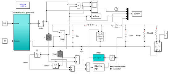 After identifying the best gains of the proposed PIλ-based OF-INRT, the tracking performance of the SCA-based MPPT, i.e., SCA-MPPT, was examined and assessed by numerical MATLAB simulations under a changing temperature and load demand. The idea of changing the operating conditions was to investigate the tracking ability of the SCA-MPPT tracker. The scheme diagram of the system is presented in Figure 5. It includes one TEG module, DC–DC converter operating in a continuous conducted current mode with a switching frequency of 30 kHz, an input inductance of 1 mH, and an output capacitor of 47 μF. The load value was 10 Ω. At a time of 0.6 s, an extra resistance of 10 Ω was added in parallel to the load. The cold side temperature of the TEG raised from 30 °C to 50 °C at a time of 0.3 s, whereas the hot side temperature was reduced from 300 °C to 250 °C at a time of 0.3 s and then returned to 300 °C at a time of 0.9 s.