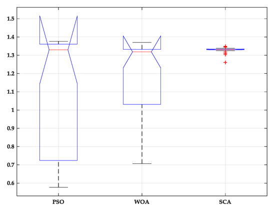 On the other hand, an analysis of the variance test (ANOVA, [44,45]) was conducted to verify the consistency of the SCA in determining the parameters of OF-INRT. ANOVA test results are presented in Table 4, and the distribution of the observations through the number of runs is presented in Figure 7. From these results, the p-value was much higher than the F value, which confirmed the difference between the provided performances. As illustrated in Figure 7, the SCA could provide the best results in terms of the mean fitness. Moreover, it had the lowest variation range where the fitness function varied from 1.26059 to 1.34877. Accordingly, the results demonstrated the SCA’s robustness and consistency.