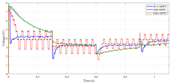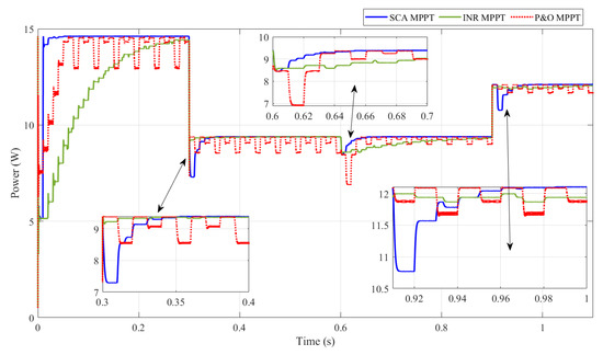 To confirm the superiority of the optimized fractional SCA-MPPT controller, the tracking ability was compared with the classical INR and P&O techniques as shown in Figure 8, Figure 9, Figure 10 and Figure 11. For the conventional INR approach, the gain of the discrete integrator was assumed to be 0.8. However, for the SCA-MPPT, the fractional PIλ controller’s parameters were 0.03765, 8.43451, and 1.01008 for the proportional gain, integral gain, and fractional-order coefficient, respectively, as summarized in Table 2. Figure 8 presents the TEG power for the three reported MPPT strategies with changing operating conditions, load, and temperature variations. Based on these conducted results, it can be noted that the SCA-MPPT reached the MPP of 14.6 W faster compared to the traditional INR and P&O MPPT techniques. The classical INR MPPT still needed more time to catch up to the MPP due to the slow dynamic response of the INR tracker. The fluctuations around the MPP were removed thanks to the SCA-based PIλ compared with the basic P&O approach. At the time of 0.3 s, the temperature difference was reduced from 270 °C to 200 °C. Therefore, the maximum output power was reduced from 14.6 W to 9.4 W. At the time of 0.6 s, the load demand deceased from 10 Ω to 5 Ω. The SCA-MPPT rapidly came back to the MPP, whereas the P&O and INR required extra time to modify the duty cycle value to attain the MPP as presented in Figure 11. In addition, at the time of 0.9 s, the difference temperature increased from 200 to 250 °C. Hence, the output power increased from 9.4 W to 12.11 W. The tracking performance of the SCA-MPPT was better than those of the INR and P&O techniques. The detailed variations of the TEG current, TEG voltage, and PWM duty cycle are presented in Figure 9, Figure 10 and Figure 11, respectively.