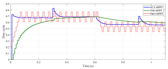 Detailed system performance with different MPPTs under load and temperature variation: PWM duty cycle.