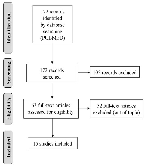 Two reviewers (V.M. and S.L.G.) screened the articles for relevance based on titles and abstracts. The same reviewers screened the full texts of potentially eligible articles. Figure 1 summarizes the study selection process. We identified 172 articles through the four electronic databases and 67 of them were identified as potentially eligible based on evaluation of titles and abstracts. Of them, 52 were excluded following full-text evaluation (out of topic). Therefore, 15 articles were included in this review: seven concerning healthy children [11,12,13,14,15,16,17], three concerning children with CRDs [18,19,20], two concerning COVID-19 pandemic [21,22], and three focused on psychological wellbeing [23,24,25].