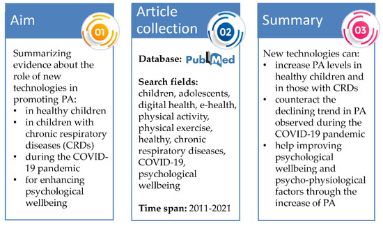 On 31 May 2021, we searched PubMed, using the following keywords, separately and in combination: children, adolescents, digital health, e-health, physical activity, physical exercise, healthy, chronic respiratory diseases, COVID-19, psychological wellbeing. An example of keyword combination was the following: “(children OR adolescents) AND (digital health OR e-health) AND (physical activity OR physical exercise) AND (healthy OR chronic respiratory diseases OR COVID-19 OR psychological wellbeing)”. The inclusion criteria were: (1) articles introducing and/or testing new technologies for promoting PA in healthy subjects or subjects with CRDs up to 18 years; (2) reviews, protocols, trials, observational studies and feasibility studies; (3) publication year from 2011 to 2021; (4) English language. The exclusion criteria were: (1) out of topic; (2) editorials, abstracts, letters, and case reports. Articles concerned with COVID-19 pandemic and psychological wellbeing were identified and described in separate sections. For included articles, we screened the reference lists and searched for potentially relevant citing articles in Scholar.