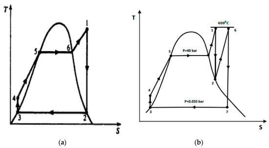 (a) T-S Rankine cycle with superheat; (b) T-S reheat Rankine cycle.