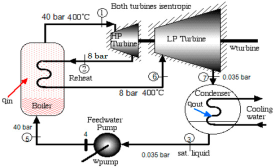where (kJ/kg) is the heat rejected in the condenser during an isothermal heat rejection process, while and are the enthalpies at states 7 and 3 of the reheat Rankine cycle respectively.