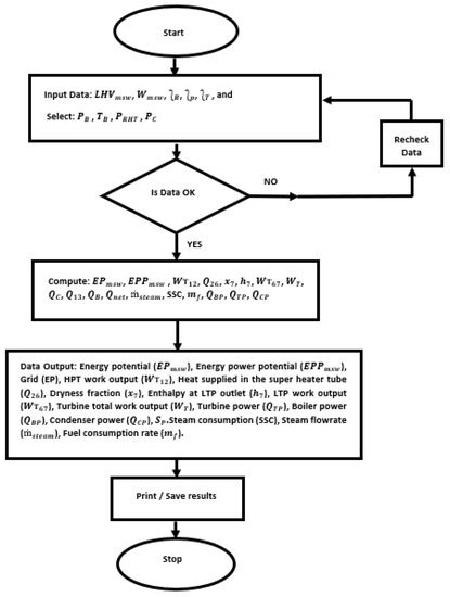 The nomenclature of all the parameters used in modeling the energy and electrical potentials of MSW, and the parameters used in modeling the power plant capacity required were prepared. An algorithm based on Equations (2)–(19) was prepared, which was translated into computer soft code using Java programming language (which is one of the common languages used in numerical analysis and a unified modeling language) [25]. The flow chart upon which the algorithm is based is shown in Figure 4. The software interface was developed using Java swing utilities which comprise mostly of JFrames, JTextrafields, JButtons, and JEditorpane for data display. Action listeners and action events were used to control the button functionalities, handle calculations, and panel/Editorpane displays. Java was used due to its flexibility, object-oriented programming language, and its multi-platform capabilities, which allows it to function on any operating system (OS). The conversion ratios for MSW in tons to kilograms, the heating value in MJ/kg to energy potential in kWh, the saturated and superheated water tables, and steam properties were incorporated into the software’s database [25].