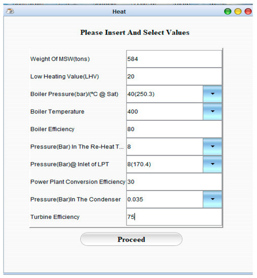 - The weight of MSW available for energy generation, heating value of the MSW, boiler efficiency, conversion efficiency, and turbine efficiency was supplied into the corresponding designated box in the input interface shown in Figure 5,