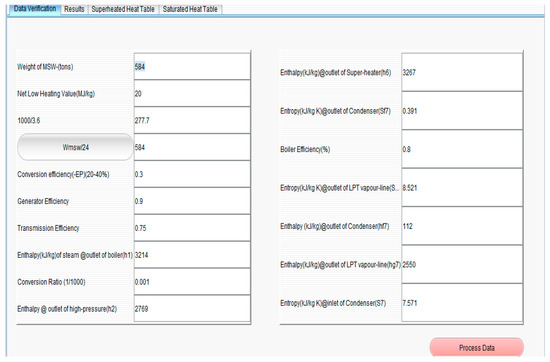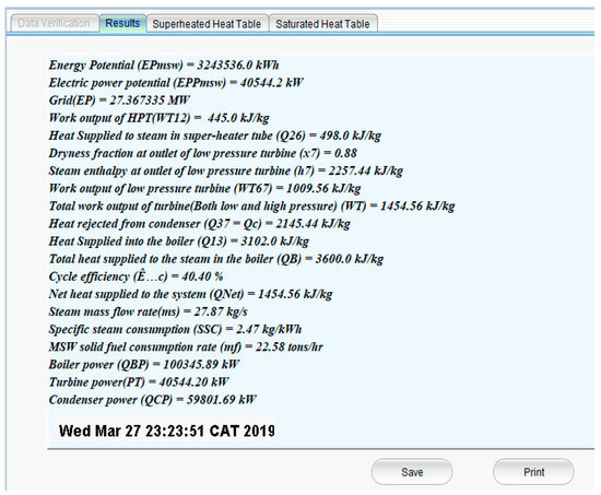 The appropriate way to validate the efficiency of the software developed can be validated by comparing the manually-calculated values to the values obtained from the software package [65]. The values presented in Table 7 show that the accuracy of the software is 99%. This software can be used to predict the energy and power potentials of MSW in any location at any time, provided the weight and the low heating value are known. Nevertheless, it will excellently predict the quantity of work or heat involved in each of the power plant’s equipment, as well as the capacity of the required boiler, turbine, and condenser that will convert the MSW to electrical energy.