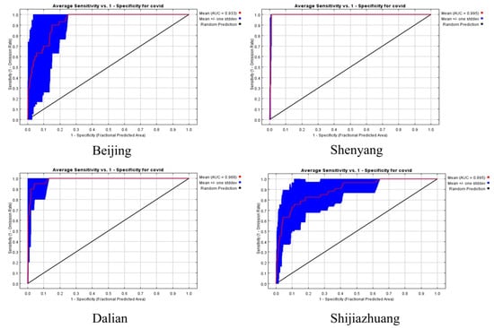 The receiver operating characteristic (ROC) curves obtained for Beijing, Shenyang, Dalian, and Shijiazhuang.