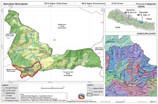 The location of the study site, Ramche Village in Bahrabise Municipality, Sindhupalchok, Nepal. Source: The original map is taken from the Department of Forest Research and Survey, Nepal via a data portal (2018). Available online: https://nepalindata.com/resource/local-resource-map—barhabise-municipality/ (Accessed on 24 January 2021).