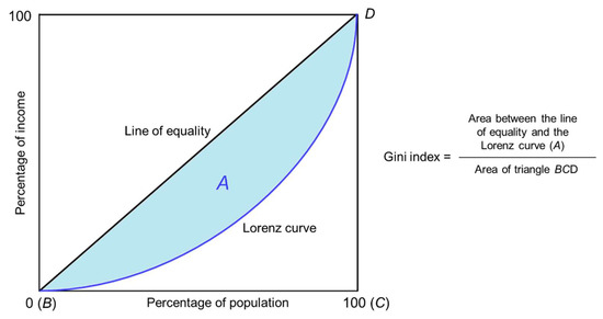 Similarly, we used the Gini index introduced by Gini [42] to measure income inequality across households. According to the OECD (n.d.), “the Gini index measures the extent to which the distribution of income (or, in some cases, consumption expenditure) among individuals or households within an economy deviates from a perfectly equal distribution.” Inequality on the Gini scale ranges from zero, when the distribution of income or consumption is perfectly equal, to one, when all the income or consumption goes to a single household.