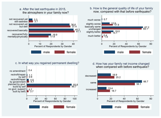 Figure 4 shows the perception of recovery, the situation of reconstruction of family houses, and their income by gender in March 2020. The respondents were asked, “After the last earthquake in 2015, how is the atmosphere in your family now?” and the result is shown in Figure 4a. While 3.3% male and 3.7% female respondents said, “not recovered yet, still in sadness,” 40.2% male and 41.1% female respondents remarked that they were “recovered basically” and 19.9% male and 17.8% female respondents said “recovered fully, mentally as well as physically.”