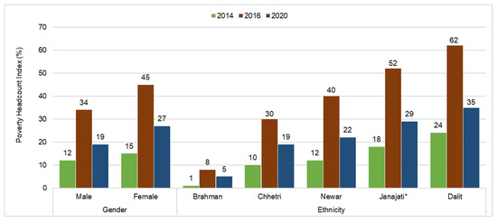 Poverty headcount index by gender and ethnicity, 2014–2016–2020. Notes and source: While the data for 2014 are taken from Sapkota [38], the indexes for 2016 and 2020 are calculated based on the survey data of the panel households collected by the authors; * Janajati excluding Newar.