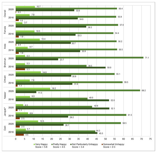 Subjective well-being, the happiness of respondents, 2016–2020. Note: * Janajati excluding Newar. There were no respondents with scores of exactly 4 and 6.