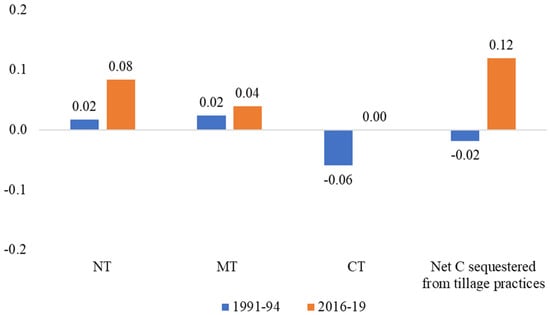 The net change in SOC levels from changes in cropping practices is presented as a net amount per ha. For changes in tillage practices, the net effect per ha was calculated by summing the SOC gains resulting from the adoption of NT and MT practices, subtracting the C emitted from the soil from the use of CT, and dividing this net effect by the total hectares included in the sample (Figure 1).