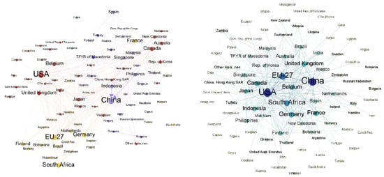 The nickel international trade orientation network in 2019 (left, weighted; right, nonweighted).