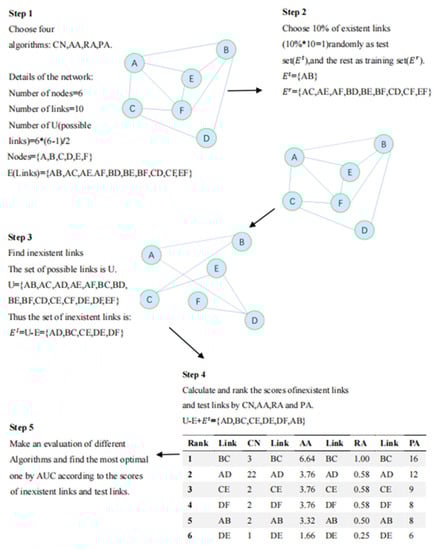 The AUC can be regarded as the probability of randomly selecting an edge in the test set, whose fractional value is greater than that obtained by randomly selecting an edge that does not exist. When conducting numerical estimation, the fractional value of randomly selecting an edge from the test set is compared to the fractional value of a randomly selected edge that does not exist. If the fractional value of an edge in the test set is higher than that of an edge that does not exist, one point is added. If two points are equal, 0.5 of a point is added. When independently comparing l times, denotes the number of times that the fractional value of edges in the test set is greater than that of nonexistent edges, and denotes the number of times that the two-point values for comparison are equal.
