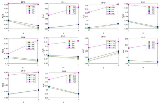 To more accurately find the implicit trade relationship, we predict the nickel ore trade for each year. Four different algorithms are used to calculate for each year to obtain AUC scores. To reduce the impact of randomness on the prediction results, we calculate each network ten times. For this process, each time the network is randomly divided into a 10% test set and a 90% training set, the average AUC scores are obtained. The most accurate algorithm was found by comparing the AUC scores. The results are shown in Figure 3. In the figure, α denotes the type of nickel ore trade network. When α is 0, this indicates that the network type is a directed weighted network; that is, both the trade direction and trade volume are considered. When α is 1, this indicates that the network type is a directed unweighted network; that is, the trade volume is not considered. Through the comparison of AUC scores, we found that in all networks, the AUC scores of the PA algorithm were the highest at greater than 0.9 and close to 1. Therefore, the PA method is identified as the best method in our study. Based on the calculation results for this decade, the AUC score of the network without considering trade volume is higher in terms of predictions. Therefore, we use the PA algorithm for the directed and unauthorized network to predict potential trade relations.